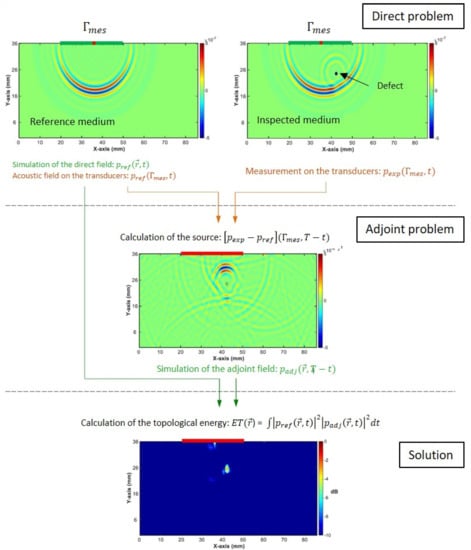 The principle of the method is to minimize a cost function defined as the distance between the two media so that the reference medium, by inserting defects at the right locations, converges to the unknown one. The mathematical proofs are not presented in this paper and can be found in [,]. Nevertheless, a summary of the steps needed in the application of the topological energy method to obtain a map of the unknown medium is proposed (Figure 5 illustrates the steps in the application of the topological imaging method in a general case of bulk waves in a homogeneous material):
