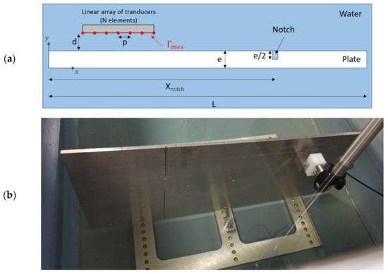 The considered plate is made of stainless steel and is immersed in water (schematic configuration and picture of the experimental setup are represented in Figure 6). Its thickness and length are defined by and . A linear phased array transducer with 16 elements that defines the surface parallel to the plate, is used as a transmitter–receiver sensor. The central frequency is . The pitch of the linear array is .