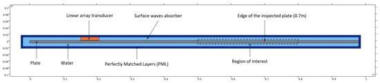 As illustrated in Figure 7, the plate is immersed in the water. Perfectly Matched Layers (PMLs) are set to simulate an infinite domain, especially at the right end of the plate to simulate the flawless infinite plate and around the domain to avoid reflections on the calculation boundaries. In the experimentation, the tank edges are far enough apart to avoid reflected waves in the studied time interval.