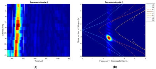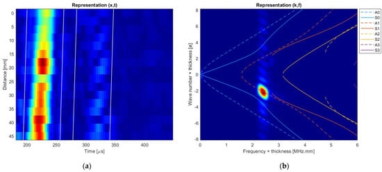 Leaky Lamb waves reflect on the edge of the plate and propagate back toward the transducer. The experimental temporal signals are extracted from each element of the linear array, and each line in Figure 8a is the envelope of the signal acquired on an element. The signals are then processed with 2D Fast Fourier Transform (2D-FFT) to transform the space–time domain into a wavenumber-frequency representation as shown in Figure 8b. This transformation allows measuring the real part of the wavenumber, the leaky attenuation, and the phase velocity of the Lamb wave. Superimposing the theoretical dispersion curves allows verifying the nature of the Lamb wave mode involved in the propagation. The emitted wave packet propagates along the x-axis and is reflected by the right edge of the plate. The wavenumber in Figure 8b is negative because of the propagation of the reflected wave along the decreasing x-axis.
