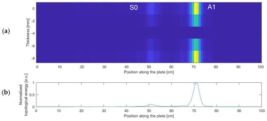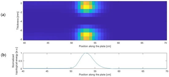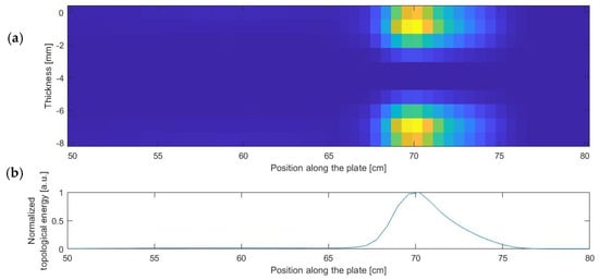 (a) Topological image in the zone of interest of the simulated plate; (b) Normalized sum of the topological energy at each position along the plate.