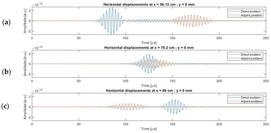 Horizontal displacements of the direct and adjoint problems at (a) cm; cm; (b) cm; cm; and (c) cm; cm.