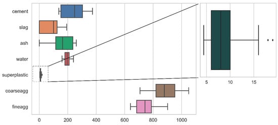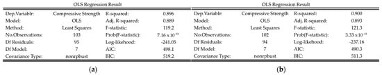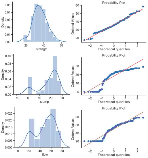 With the progress of manufacturing and control technology, the processing process has become increasingly stable and controllable. The normal distribution process has become the main distribution form of processing data in the production and assembly processes of the manufacturing industry. The way in which the processing data obey the normal distribution is called the normal process. Actual industrial data generally approximate a normal distribution. The three output variables were analyzed through density figures and quantitative quantile plots (see Figure 1). If the data does follow a normal distribution, the points on the quantitative quantile plots will fall roughly on a straight line. Compared with the other two output parameters, slump (cm) and flow (cm), 28-day compressive strength (strength) is more in line with the normal distribution and fits the product quality in high-dimensional, small-sample actual production. Finally, 28-day compressive strength is selected as the output variable of this article. The concrete slump data is complete.