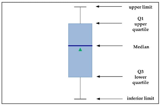In the boxplot, Q1 is the lower quartile (25% quartile), Q3 is the upper quartile (75% quartile), and the interquartile range (IQR) refers to the difference between the 25% and 75% quartiles.