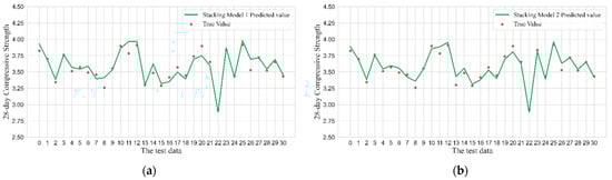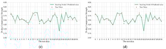Comparison of prediction errors of different stacking models: (a) Stacking model 1 builds the most relevant ensemble learning model; (b) Stacking model 2 builds the ensemble learning model randomly; (c) Stacking model 3 builds the ensemble learning model randomly; (d) Stacking model 4 builds a minimum correlation ensemble learning model. The ordinate of 28-day compressive strength is logarithmically processed.