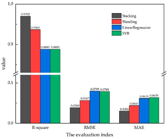 According to the evaluation index parameters, the specific results of each algorithm are shown in Figure 12. It can be determined that the of the stacking ensemble learning model is 0.9702. Compared with the blending ensemble learning model, linear regression, and SVR, the is increased by 0.0333, 0.0819, and 0.0819, respectively, and the average increase is about 0.0657; the RMSE of stacking is 0.0389, which is reduced by 0.0178, 0.0410, and 0.0399, with an average decrease of 0.0329; stacking’s MAE is 0.0304, with an average decrease of 0.0137, 0.0315, and 0.0335, with an average decrease of 0.0262. That is, the fitting effect of the stacking integration algorithm is obviously better than that of other single models, and it has higher accuracy. The two ensemble learning models are higher than the optimal single model. The , RMSE, and MAE of the stacking ensemble learning model are better than the hybrid algorithm, which proves the feasibility of the established model. The stacking ensemble learning model is more suitable for high-dimensional, small-sample quality regression prediction.