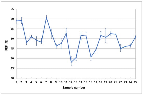 The RPT values used for the calculation of the FRP were those previously discussed, obtained and explained in our previous works []. To compare the values obtained, a comparison graph was used. As it can be observed in Figure 2, employing the SF values obtained, a regression coefficient of 0.81 was determined. The results obtained were compared with the scarce literature data [,,,,] and were found to be within the range of solid fraction values previously described in the literature. We can observe how a variation of the composition of the alloy at the studied limits promotes a clear variation of the FRP values. If we check values of the error bars, we can observe how the variation of values obtained between samples is quite small all the studied alloys, showing that the method employed is quite repetitive.