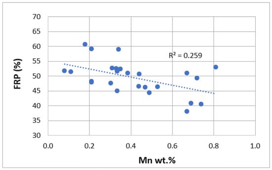 We can observe how the formula obtained has a quite high correlation coefficient value (0.81) and small standard deviation (3.41), showing a good correlation between the predicted and obtained FRP values. Therefore, Si, Cu, Mn, Ti, Zn, Pb and Sn promote a reduction of FRP values, postponing the moment when the stiffening phenomenon occurs. This negative effect of Si can be seen in Figure 3 in weight percentage ranges between 7.5 and 12.5%, and in Figure 4 in the case of manganese up to 1 wt.%. On the other hand, Mg, Fe, Ni, Cr and Sr have the opposite effect, promoting the stiffened network to form faster. In the case of Sr, its positive effect on FRP in ranges from 0% to 0.08% by weight can be seen in Figure 5. Statistical t-values (t) were evaluated to define whether there is a statistically significant influence of a certain alloying element on the studied property. When the t-value is over 2.17, the corresponding alloying element studied has a statistically significant influence. The values obtained are summarized as follows in Table 2.