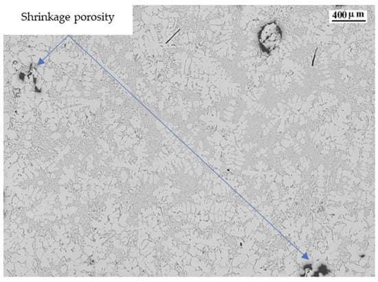 Ti is a refining element that promotes grain size reduction. Grain size reduction increases the fluidity of the alloy and the solidification time. It also increases the heat transfer from the solidifying alloy to the surroundings. We can observe in Figure 10 a well-refined structure, with small aluminum dendrites and the presence of shrinkage porosity.