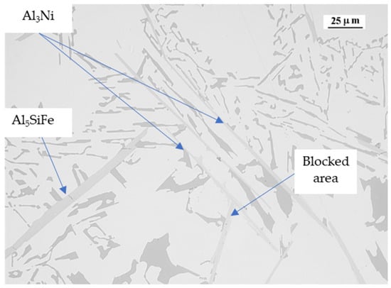 Alloy 6 micrography showing the Al5SiFe and Al3Ni phases and a blocked area.