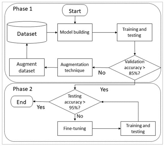 Inspired by existing approaches to developing CNN architecture, we started with an initial architecture consisting of five convolutional and two pooling layers. With our constructed dataset and the first CNN model, we achieved a training accuracy of 84.27% and validation accuracy of 40.15%. Based on previous approaches [34,35], and the low validation accuracy, it was evident that the small dataset could not give high classification accuracy. Because obtaining more user data was not an option, for achieving good accuracy, we developed a two-phase approach as shown in Figure 1. In the first phase, our focus was on improving the validation results as much as the initial training results by generating more training and validation data. Data augmentation is a useful technique to improve the performance of model and expand limited datasets to take advantage of deep learning models. The validation error must continue to decrease with the training error to develop a useful deep learning model. However, data augmentation is not only a technique to improve accuracy by avoiding the overfitting. Many other alternative solutions are model fine-tuning and hyperparameter tuning to achieve higher accuracy by avoiding the overfitting [36]. Therefore, once our desired validation accuracy of 85% could be achieved using a bigger dataset, in the second phase our focus was to improve the deep learning model to achieve a test accuracy of 95% on the test data. As can be seen in the figure, model development is an iterative process in each of these phases. In phase 2, after each cycle of training, validation, and testing, the results are analyzed, and the model is modified by fine-tuning it. At the same time, the hyperparameters are optimized to achieve the desired accuracy above 95%.