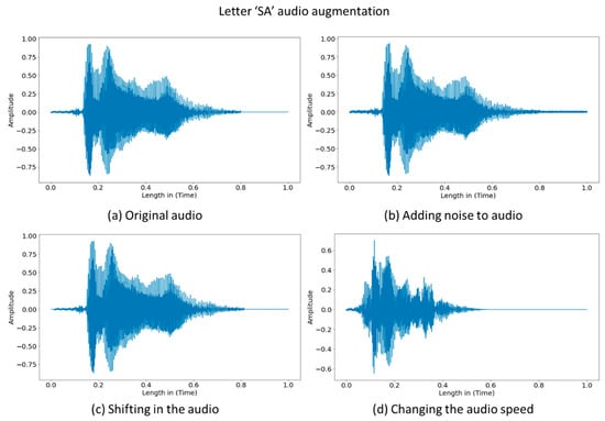 Data augmentation is a technique for increasing the number of records in the dataset by slightly modifying the copies of original data for producing synthetic data using statistical methods and algorithms. Many data augmentation techniques exist in the literature [37], so we applied a few techniques one-by-one. Each time an augmentation technique was applied, it resulted in the gradual increase of the audio instances in the dataset; we also kept evaluating the validation accuracy of the base model, which was also improving. We used the augmentation techniques of noise injection, time-shifting, and changing the audio speed using time stretch, as shown in Figure 2. Other audio data augmentation techniques, such as pitch shift, were not ideal for our dataset because it required randomly changing the pitch, thus, distorting the pronunciation. The techniques are described as follows.