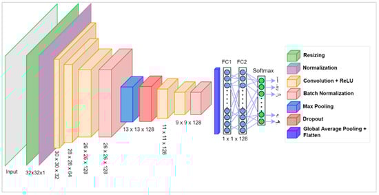 Figure 3 shows the resulting architecture after fine-tuning and applying hyperparameter tuning to the baseline architecture. As can be seen, hyperparameters have been added in the form of batch normalization and dropout layers in addition to the optimizer selection and learning weight. FC1 and FC2 represent the two fully connected layers for classification followed by the SoftMax activation function that assigns a probability to each of the output classes.