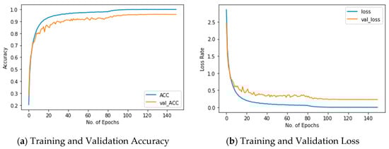 The code is executed on a GPU-based desktop system with hardware configuration of Intel (R) Core (TM) i9 CPU @3.70, NVIDIA GeForce RTX 3070, and 64 GB RAM. The model is developed and run using the TensorFlow (https://www.tensorflow.org/, accessed on 10 November 2021) platform, mainly the Keras (https://keras.io/, accessed on 10 November 2021) API. The maximum number of epochs was set to 150. It took on average 91 s to complete one Epoch. We used the Jupyter notebook in conda (https://docs.conda.io/en/latest/, accessed on 10 November 2021) environment management system with miniconda installer for running the CNN model.