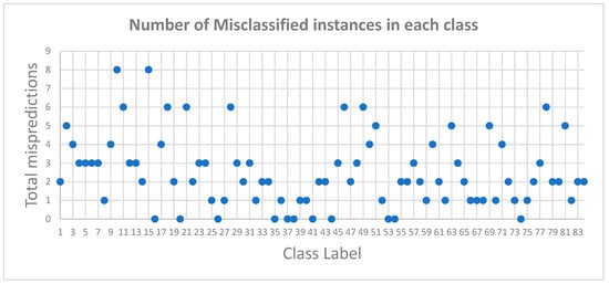 Figure 5 shows the details of the misclassification by the classifier. Eleven of the 84 classes have 0% error rate. Only 20 classes have four or more mispredictions. The Figure shows that class 10 (phoneme (ثَ, θa)) and class 15 (phoneme (جُ, dӡu)) have been misidentified a maximum of eight times. From the analysis of the confusion matrix, we observe that the topmost misclassified classes are those not spoken in CA pronunciation by the native local people. For example, class 10 (phoneme (ثَ, θa)) is often pronounced as 7 (phoneme (تَ, ta)) in local Arabic dialect.