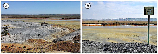 Field pictures of the degraded land area showing the abandoned stockpiles of crushed pyrite ore (a) and the salt marsh soil affected by the acid drainage (b).