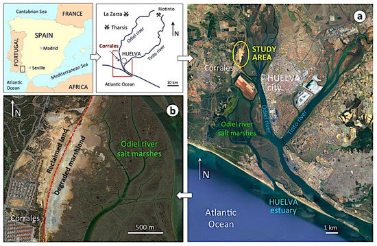 Geographical setting of the Huelva estuary showing the location of the study area (a) and the salt marsh soil impacted by past mineral handling activities (b).