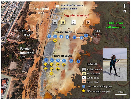 To reduce selection bias and collect representative samples of the degraded marsh, the sampling area was subdivided into three tidal flat zones based on the dominant colour of the surface soil, namely the yellow zone, white zone, and ochre zone, which are aligned in a north–south direction nearly parallel to the sulphide stockpiles that lie directly on the soil adjacent to the marshland (Figure 3). The samples chosen are representative of the Salic Fluvisol adversely affected by continuous discharges of AMD.