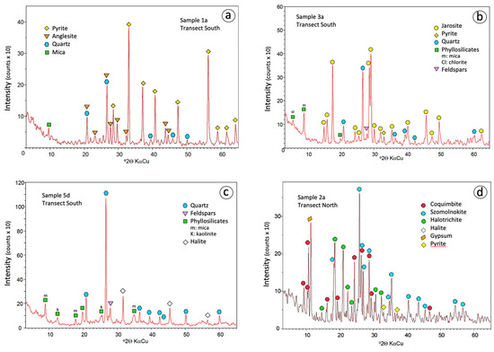 Powder XRD diffractograms of representative samples of the sulphide wasteland (a), yellow zone (b), ochre zone (c), and sulphate crusts (d).