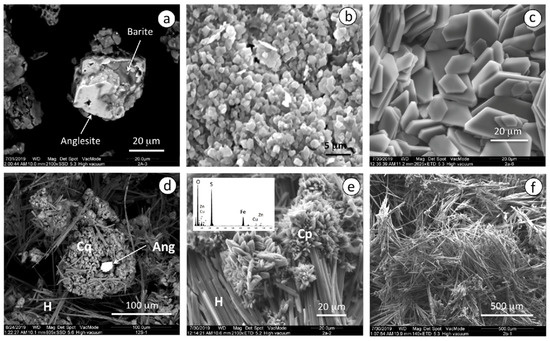 SEM images showing: (a) epitaxial overgrowth of anglesite on barite; (b) micron-sized crystals of jarosite; (c) tabular crystals of copiapite with pseudo-orthorhombic symmetry; (d) efflorescent mixture of coquimbite (Cq) and halotrichite (H) with anglesite (Ang); (e) inset EDS spectrum of copiapite (Cp) grown on fibrous aggregates of halotrichite (H); and (f) bundled, fibrous crystals of halotrichite.