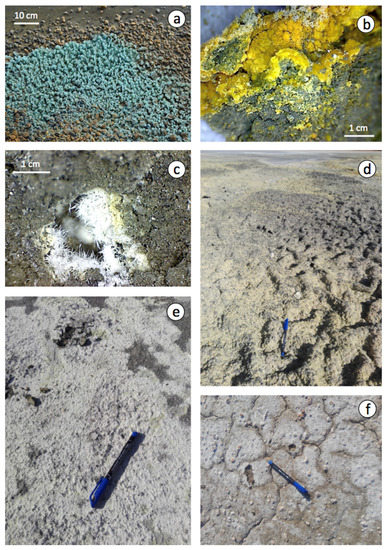 Efflorescent blooms of sulphate minerals on the surface of the pyrite wastes: (a) greenish-blue crystals of melanterite; (b) fine-grained yellow crust of copiapite; (c) white hairy halotrichite; (d,e) yellow to white encrustations of mixtures of soluble sulphate salts covering the floodplain; and (f) crystallization of efflorescent halite on soil surface with desiccation cracks (distal zone).