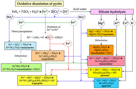 During prolonged dry weather, efflorescent blooms of hydrated sulphate salts are formed as products of evaporation of the acidic sulphate-rich solutions derived from oxidizing pyrite. Although the neoformed sulphate minerals are ephemeral, they provide important clues about the precipitation reactions from which they arise and the subsequent mineral transformations occurring with increasing temperature and/or decreasing water activity [27,34,40]. The reactions that lead to secondary sulphate-mineral formation in the study area are schematized in Figure 7.