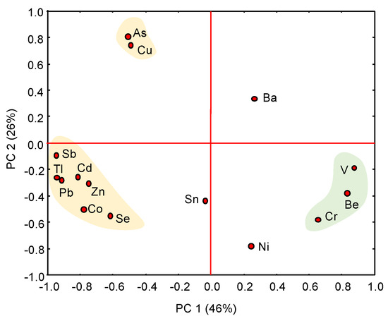 Multivariate statistical analysis showed a clear distinction between naturally occurring trace elements and PTEs transferred from the sulphidic waste piles to the adjacent marshland by both chemical and physical processes (leaching, runoff, atmospheric deposition of wind-blown dust). Several clusters are apparent on the projection of the scores on the first two principal components extracted from the PCA (Figure 8), which account for 72% of the total variance. The first principal component (PC1) is statistically dominant, showing two distinctive clusters characterized by strong and opposite scores: (1) As-Cu-Pb-Zn-Cd-Co-Tl-Sb-Se, and (2) Be-Cr-V. These geochemical associations are interpreted as formed by anthropogenic and geogenic trace elements, respectively, while Ni, Ba and Sn are probably derived from mixed sources.