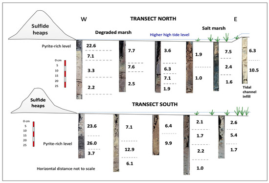 Forty samples were collected in cores along two linear transects of approximately 150 m in length spaced 120 m apart (Supplementary Figure S1), including the sulphide waste samples. Line transects were positioned perpendicular to the riverbank and randomly set up across the degraded marshland. Six undisturbed cores were taken at about 25 m intervals along each transect. The cores were extracted using a gouge auger (100 cm length and 30 mm diameter) with hammer, then divided transversely into several sections representative of different depth intervals within the soil profile based on field observations of soil colour and texture. An additional soil core was augered in the tidal channel near location 6 of the northern transect.