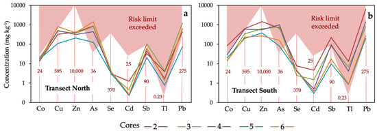 Median concentrations of trace elements in the soil cores collected in each sampling site of the north transect (a) and south transect (b). The red dashed vertical lines indicate the regulatory guidance values for soils of southern Spain [46], above which adverse effects on human health may occur.