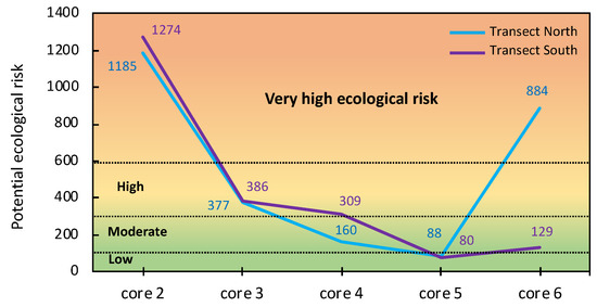 Potential ecological risk values of As, Cd, Cu, Pb, and Zn in the surface samples of the soil cores collected in each transect.