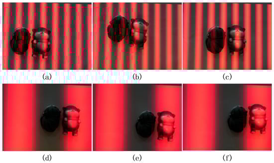 At the beginning, the high frequency fringe pattern is projected and three images with object motion are captured, as shown in Figure 2a–c. Then, the low frequency fringe pattern is projected and three images with motion are captured, as shown in Figure 2d–f.