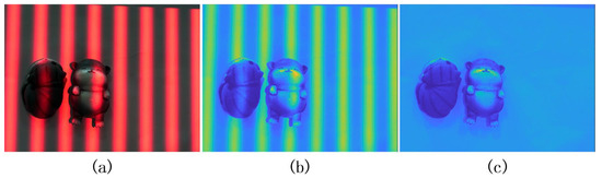 The experimental setup is shown in Figure 1a. It includes two color cameras (Manta 504C with 2452 × 2056 resolution, Allied Vision Technologies Inc., Freistaat Thuringen State, Germany) and a projector (Wintech DLP PRO 4500 with 912 × 1140 resolution, Wintech Digital System Technology Corp., Beijing, China). Please note, only one camera is used in the proposed method. The isolated models shown in Figure 1b are reconstructed by the proposed method based on three-step PSP. As the isolated objects are reconstructed, the dual-frequency phase unwrapping method is employed. Two-dimensional movement is applied on the object during the reconstruction. The same with the method in [16], a red fringe pattern is projected for convenient movement tracking. With the captured images, the red channel provides the sinusoidal fringe information, and the blue channel contains the pure object image without the fringe pattern. Then, the phase information and object movement information can be retrieved from the images in different channels. Three images are captured, respectively, during the projection of the high frequency (30 pixel/fringe) and low frequency (150 pixel/fringe), and Figure 1c,d show their first image.