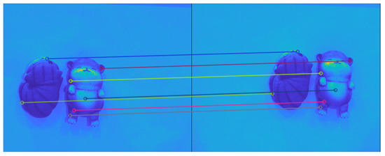 The SIFT (scale-invariant feature transform) [21] algorithm is implemented on the blue component images to track the object movement, as shown in Figure 4. Then, the rotation matrix and translation vector are calculated by the SVD (singular value decomposition) algorithm [18].
