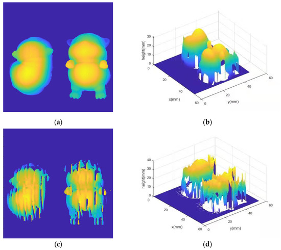 With the correct phase map, the object is reconstructed successfully, as presented in Figure 7a,b. It is apparent that the object is reconstructed well. The object is reconstructed by the traditional PSP for comparison (as given in Figure 7c,d). It can be seen that a high-accuracy result is achieved by the proposed method, and the motion-induced error is removed.
