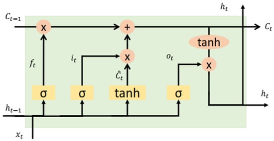 These problems are solved by LSTM networks, which incorporate a series of steps to decide which information is to be stored and which is to be erased with three gates that control the way information flows in and out of the unit [], as shown in Figure 2.