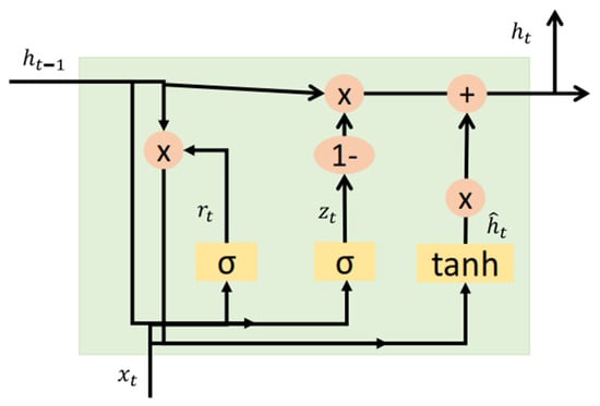 The Equations (9)–(12) describe the operation of a GRU neuron. Initializing t = 0 and the output vector = 0 [].