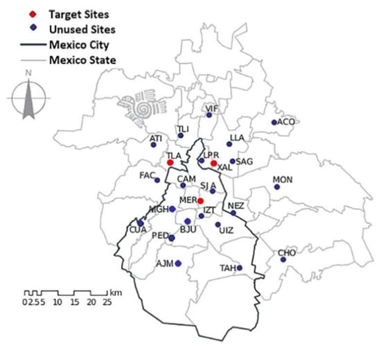 The study area corresponded to Mexico City and its surroundings (Mexico), where the RAMA network is located. Figure 4 shows the location of the monitoring stations [,]. The stations whose records are analyzed in this work, which are: TLA, MER, and XAL, belonging to the delegations of Tlalnepantla de Baz (State of Mexico), Venustiano Carranza (CDMX), and Ecatepec de Morelos (Mexico State), respectively [], are highlighted in red.