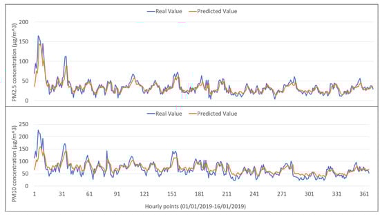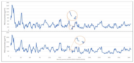 The behavior of PM is highly nonlinear, as shown in Figure 5, which shows the behavior of and for the first 16 days of January, 2019. Both records have a discontinuous interval, which represents no accurate record at that precise moment, and the missing values had to be proposed and interpolated to maintain continuity (section highlighted in orange).