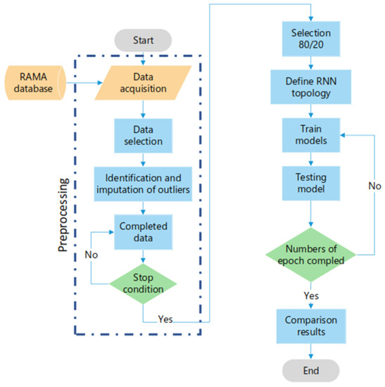 - Optimizer. Methods by which the algorithms are used to readjust their internal parameters, thus improving the learning of the implemented algorithm. For the present work, we used the optimizers Adam and Adamax, which are widely used with time series data, because they employ a stochastic gradient method based on the adaptive estimation of first and second-order moments [,,].