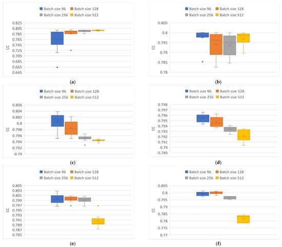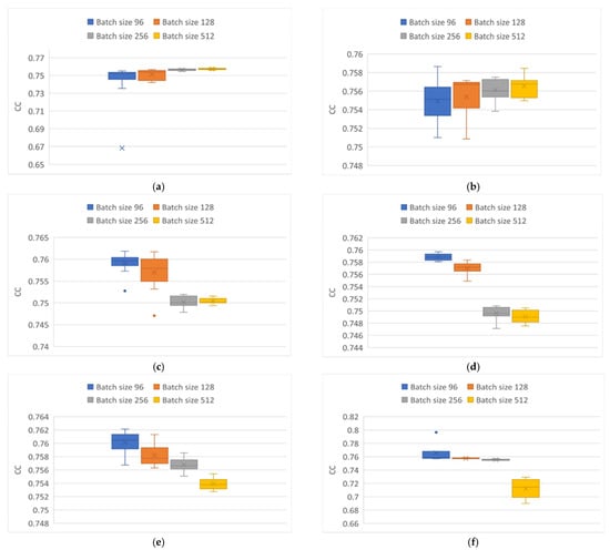Figure 9 shows the results obtained from the CC of the particle modeling. The implemented Elman architecture (Figure 9a,b) presented the least variation in the results obtained with a batch size of 512 and the Adam optimizer, with a mean of 0.79. Curiously, highest variation occurred when the Elman architecture was presented with the batch size of 96. With the Adamax optimizer, there was a greater variation with batch sizes of 128 and 256. The best results came from the batch size of 96, followed by the batch size of 512 with approximate means of 0.799 and 0.797, respectively. For Figure 9c,d, corresponding to the GRU architecture, there was a decrease in the CC with an increase to the implemented batch size, regardless of the optimizer, as is highlighted in the greater compactness of the results with batch sizes of 256 and 512 with the Adam optimizer, with mean CC values of 0.795 and 0.794, respectively. In the case of the results with the Adamax optimizer a constant reduction was shown as the batch size increased, maintaining a practically constant amplitude of 0.002. Finally, items Figure 9e,f, corresponding to the LSTM architecture, show that with batch sizes of 96, 128, and 256, they had average CC values of 0.79 for both optimizers, with greater compactness observed with the Adam optimizer, while for a batch size of 512 there was a considerable difference. In the LSTM architecture, the optimizer does not show a representative change for this application.