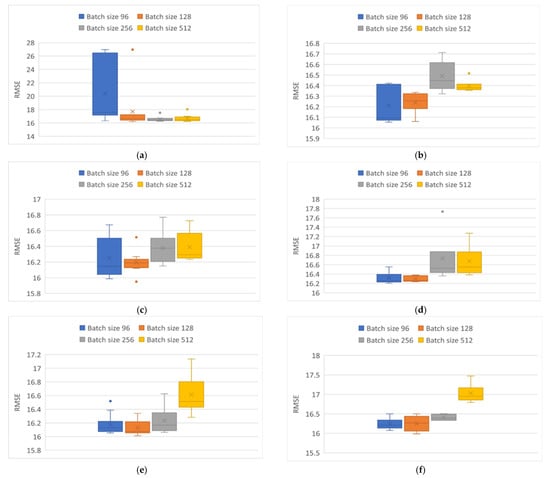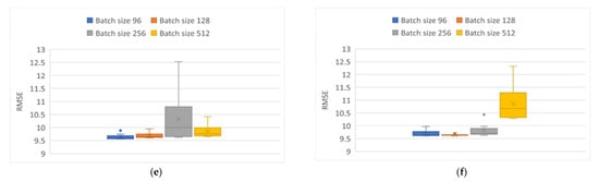 Finally, Figure 11e,f indicate that, in the LSTM network, the expected results was observed. This means that the RMSE increased with larger batch sizes. Also, there is a difference between using the Adam and the Adamax optimizers, especially in the results of the batch size of 96. The Adam optimizer obtained results with a mean of 16.1, with a single outlier. In the case of the batch size of 128, the same low variance was observed, but without the outlier. With the Adamax optimizer, the results with greater repetitiveness were presented with the batch size of 256, for the batch size of 128 it had a mean of 16.25 with a variance of 0.5, which was greater than that present in the batch size of 96 maintaining a similar mean.