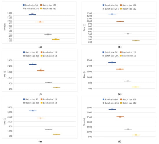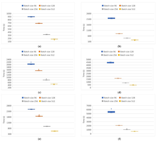 Regarding the Adamax optimizer (Figure 10b and Figure 11b) with batch sizes of 256 and 512 there was greater variability in the results obtained, and an average of 10.25 was maintained in both cases. With batch sizes set to 96 and 128, a similar consistency was observed, with a mean of approximately 9.6. In Figure 10c,d and Figure 11c,d, corresponding to the GRU architecture, the results present a higher variability, which is more visible with batch sizes of 256 and 512 for both optimizers. With batch sizes of 96 and 128, the Adamax optimizer showed higher repeatability in the results than the Adam optimizer. Finally, Figure 10e,f and Figure 11e,f correspond to the implementation of the LSTM topology. This network presented different behavior between them; in the case of the application of the Adam optimizer there was a greater variation in the results with batch size of 256, with an average of 10.4, but this variation decreased with batch size of 512, obtaining an average of 9.9.