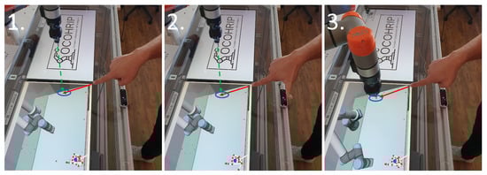 Process of controlling the robot via pointing gestures. 1—The operator points to a location. 2—The operator performs “pistol” gesture. 3—The robot’s TCP moves to the appointed location.