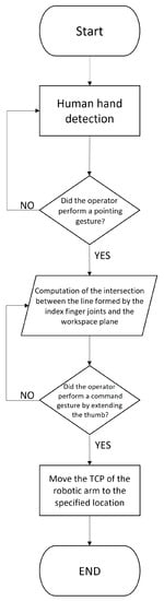 The core functionality of the proposed framework follows specific consecutive steps. The operator first performs a pointing gesture, pointing to the particular location in the (planar) workspace of the robot. Then, the robot computes the specified location defined by the planar surface and the half-line formed by the operator’s joints. When the operator is satisfied with the pointed place, he performs a command gesture, triggering the signal to move the robot’s end effector to the desired location. The whole process is illustrated in Figure 5. The half-line is defined by the direction of the index finger, as it is the most common way to represent a pointing gesture. The following command gesture was specifically designed to be performed naturally, fluently connecting with the previous gesture while not significantly influencing the pointing precision. The command gesture is achieved by extending the thumb, forming a so-called "pistol" gesture. Both gestures are depicted in Figure 6. Custom ROS packages and nodes were created for gesture recognition and intersection computation. The ROS-enabled machine connected to the robotic arm manages these nodes, ensuring proper communication between the individual parts of the whole application. The method’s architecture in ROS framework is depicted in Figure 7. The flowchart of the method’s process is in Figure 8. The most prominent geometrical features for the mathematical description of the concept are illustrated in Figure 9. The global coordinate system G defines the planar ground surface .