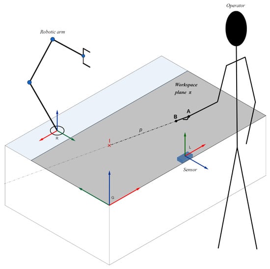 The Leap Motion sensor determines the position of the joints of the human hand in its coordinate system L; furthermore, the robotic manipulator operates in its coordinate system R. The unification of those coordinate systems is vital to obtain points A and B coordinates defining the half-line , which ultimately determines the coordinates of intersection I. All of the calculations are done in the global coordinate system G. Hence, the following homogeneous transformations between R and G, L, and G are defined: