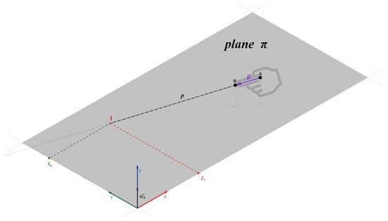 Analytical geometry and vector algebra are used to calculate the desired coordinates. The data acquired from the Leap Motion sensor are transformed based on Equation (1). The points and vectors used in the calculation are illustrated in Figure 10.