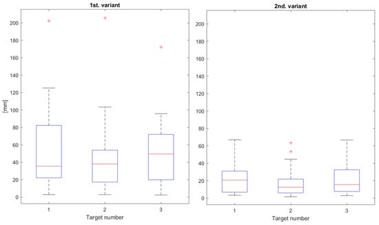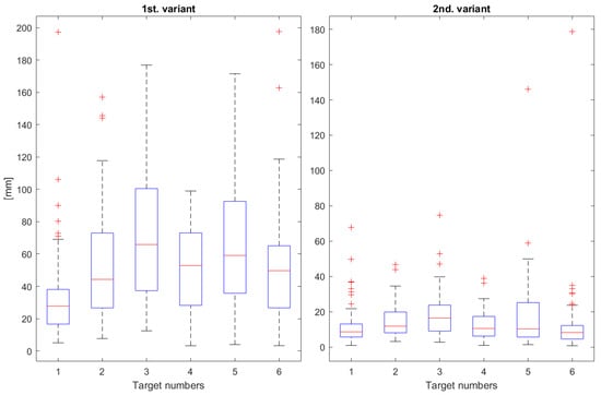 The measured coordinates for each target marker relative to the desired position are depicted in Figure 15 and Figure 16. The blue markers represent the first variant, where the user had no visual feedback. The red markers represent the second variant of each experiment. The euclidean distance between each measured point and the desired position was computed to quantify the precision of pointing for each experiment. Figure 17 and Figure 18 show the boxplots of the euclidean distance data for each experiment scenario. The mean deviation in position and the overall deviation are shown in Table 2 and Table 3.