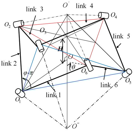 Three non-adjacent joints are constrained to remain in a fixed horizontal plane (joints on the vertexes of an equilateral triangle), while the other three joints will be disposed in a parallel plane (joints on the vertexes of another equilateral triangle). Such a device will describe a parallel motion of three non-adjacent joints according to the other three non-adjacent joints as in Figure 4.
