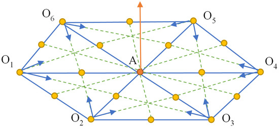 Another possibility is to put the mechanisms in a hexagon O1O2O3O4O5O6, with a fixed center A in the horizontal plane, summing a total of 36 joints, as can be seen in Figure 6 below. In point O1, there are two superposed joints, from a two side-by-side 6R mechanism, while in point A, there are six superposed joints, from all six mechanisms. Each nonadjacent joint, O1, O2, O3, O4, O5, and O6, will have an imposed straight in-plane linear movement, to the center of gravity of its own initial triangle (O1 and O2 to the gravity center of the O1O2A triangle, and so on). At the end of the movement, all 36 joints will be on the vertical line from the horizontal plane in A point.