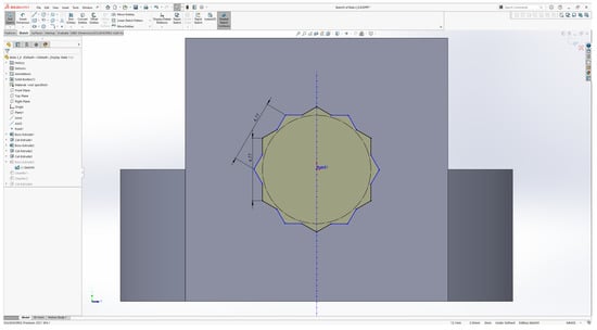 In order to tighten the mechanism in the central position, each 6R assembly was constrained in relation to a sketch in which construction geometries (axis of translation of the joints) were made at angles of 30 degrees between them. The configuration can be seen in Figure 11.